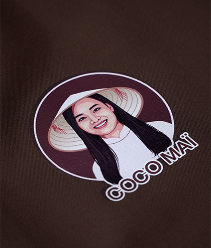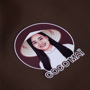- Hình in/thêu cô gái kèm theo slogan của nhà hàng ở trước ngực sắc nét, bền màu tạo nên sự chuyên nghiệp và dễ dàng nhận diện thương hiệu.