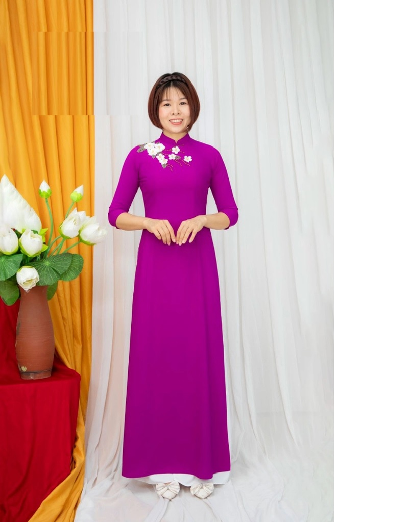Màu tím nổi tiếng với sự thủy chung và mềm mại và khi được tích hợp vào áo dài, tạo điểm nhấn cho vẻ đẹp của người phụ nữ. Áo dài được phối kết hợp với quần màu trắng tạo nên sự tương phản đậm nhạt trên tà áo, tạo nên điểm nhấn đặc biệt nhất.