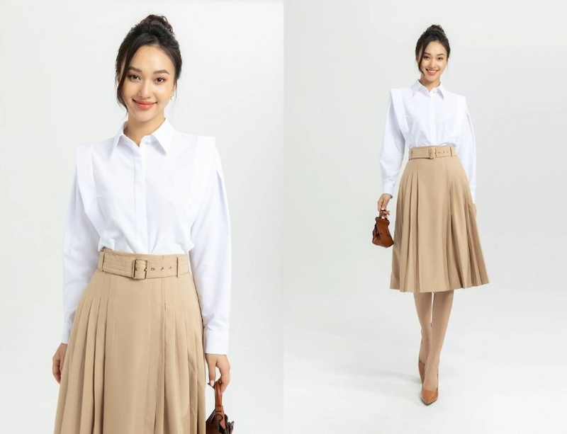 Áo sơ mi dài tay cũng có thể kết hợp với chân váy để tạo ra vẻ đẹp thanh lịch và nữ tính. Sự kết hợp này thích hợp cho những dịp đặc biệt như dự tiệc hoặc hẹn hò. Chân váy mang lại sự dịu dàng và quyến rũ, khiến cho người mặc trở nên cuốn hút và quyến rũ hơn.