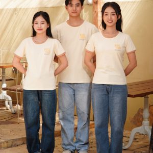 Áo thun được thiết kế theo dạng unisex, phom suông vừa phải, phù hợp nhiều vóc dáng và mang lại sự thoải mái cho cả nhân viên nam và nữ. Tay áo bo nhẹ giúp giữ form đẹp mà không gây bí bách trong quá trình hoạt động. Bộ đồng phục còn kết hợp cùng tạp dề nửa người, giúp thao tác nhanh, gọn mà không bị vướng víu. Tổng thể trang phục tạo cảm giác năng động, linh hoạt và thân thiện, rất phù hợp với môi trường F&B yêu cầu di chuyển nhiều, phục vụ liên tục nhưng vẫn giữ được sự chuyên nghiệp.