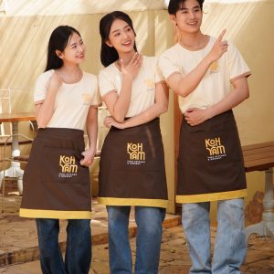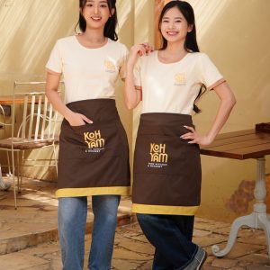 - Tạp dề nâu viền vàng: được bố trí logo ở vị trí trung tâm, tạo điểm nhấn trực quan và tăng tính chuyên nghiệp của bộ đồng phục.