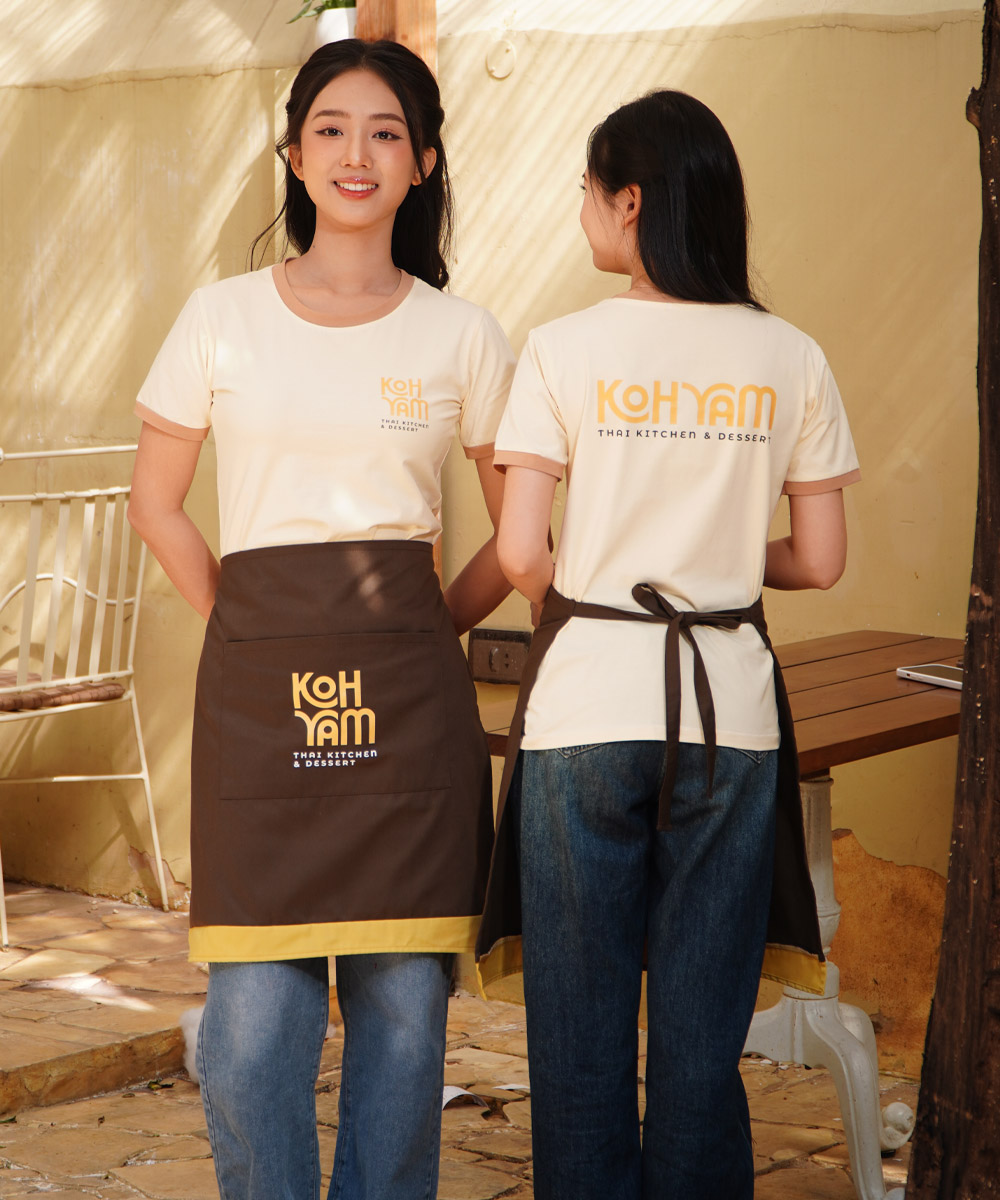 Sự kết hợp này tạo nên một tổng thể trang phục có chiều sâu thương hiệu, nhất quán từ áo đến tạp dề, giúp hình ảnh Koh Yam trở nên chuyên nghiệp và dễ ghi nhớ hơn trong mắt khách hàng.
