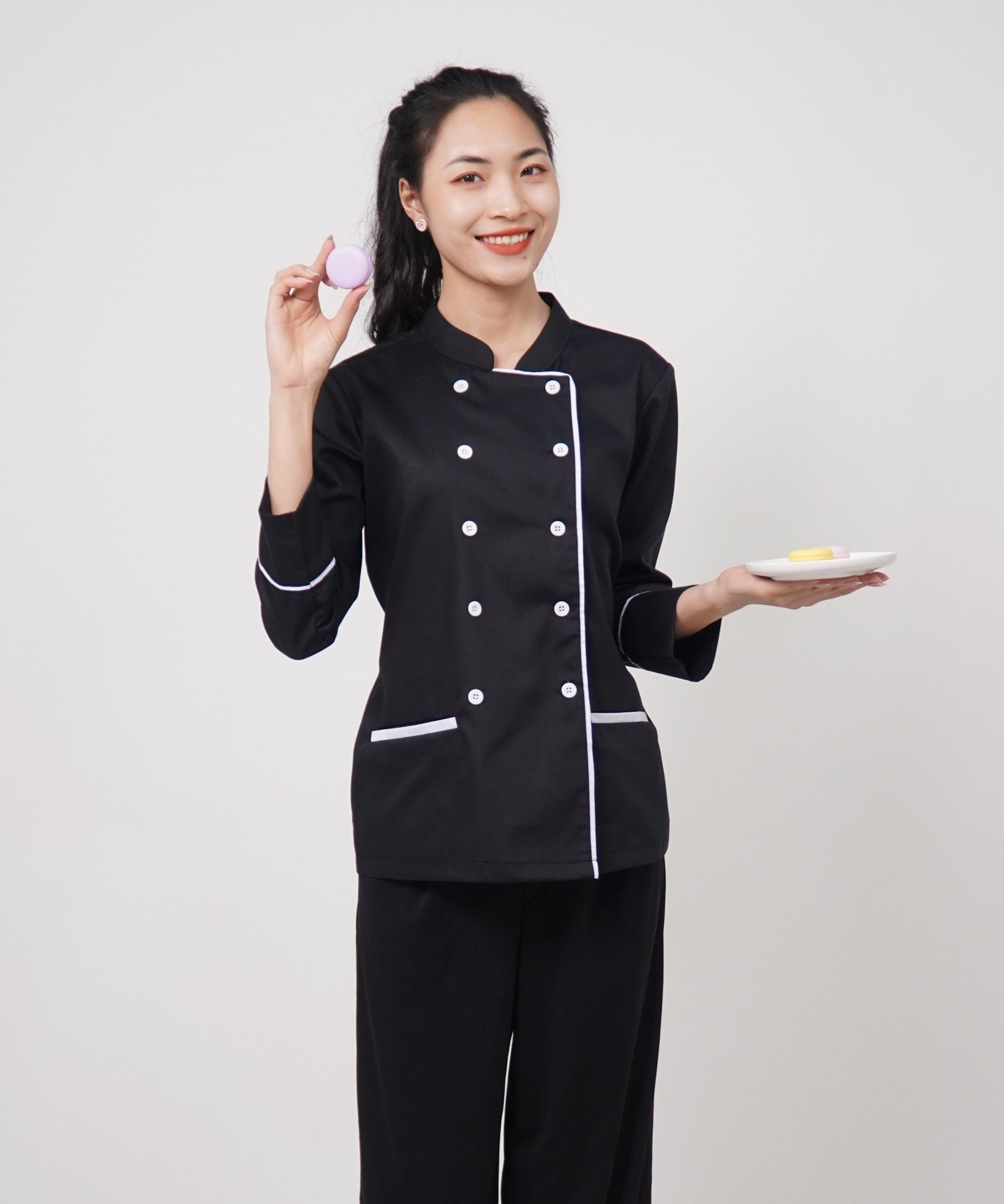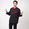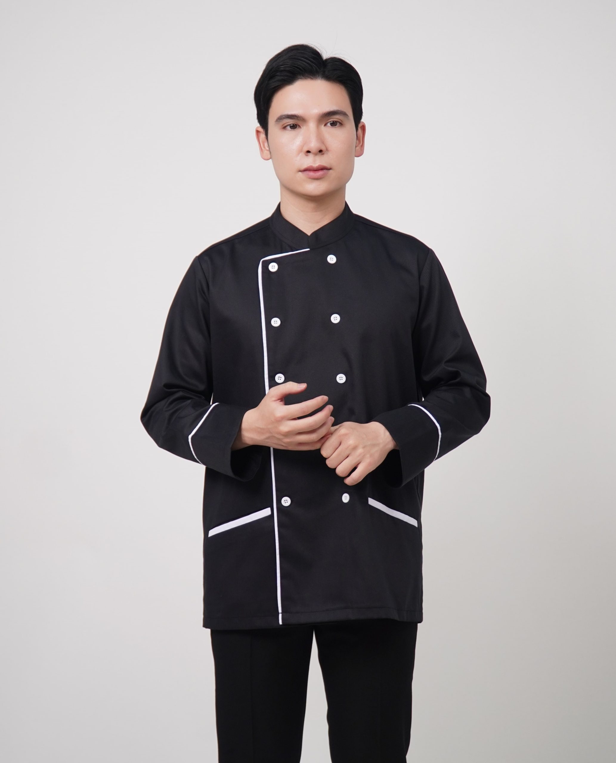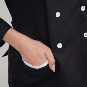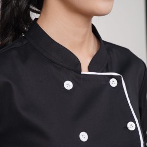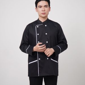 Đồng phục áo bếp Handy Uni mẫu 3 kết hợp giữa vải đen với họa tiết kẻ trắng đem lại cảm giác hiện đại, sang trọng và cao cấp. Đây sẽ là sự lựa chọn hoàn hảo cho khu vực bếp của nhà hàng – khách sạn thêm chuyên nghiệp và đẳng cấp.