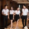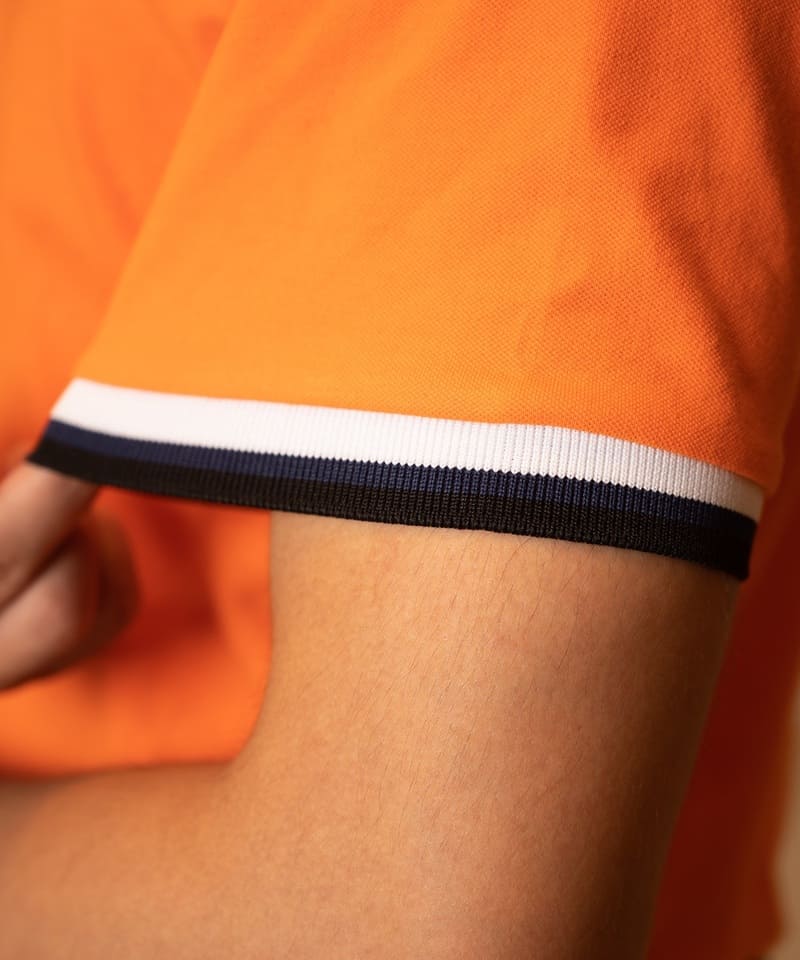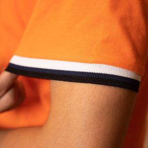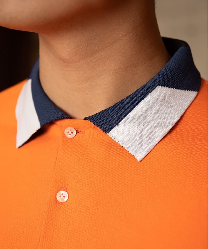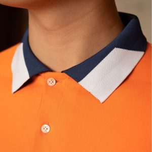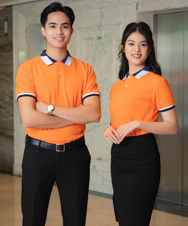 Đồng phục công ty màu cam phối cổ áo và tay áo viền xanh trắng đen