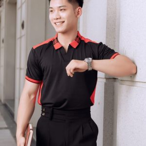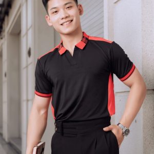 Thông tin chi tiết sản phẩm đồng phục công ty màu đen phối cổ áo và tay áo đỏ đen