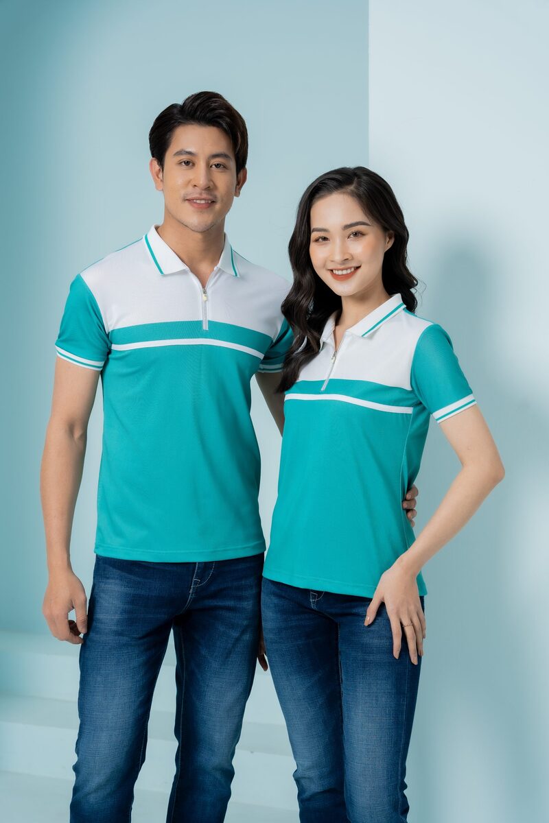 Áo polo đồng phục công ty màu xanh phối trắng cổ khóa kéo là lựa chọn hoàn hảo cho những doanh nghiệp muốn thể hiện sự năng động, sáng tạo và chuyên nghiệp.