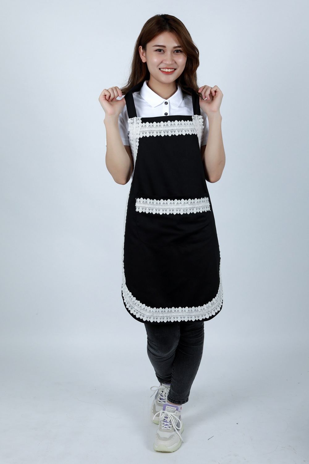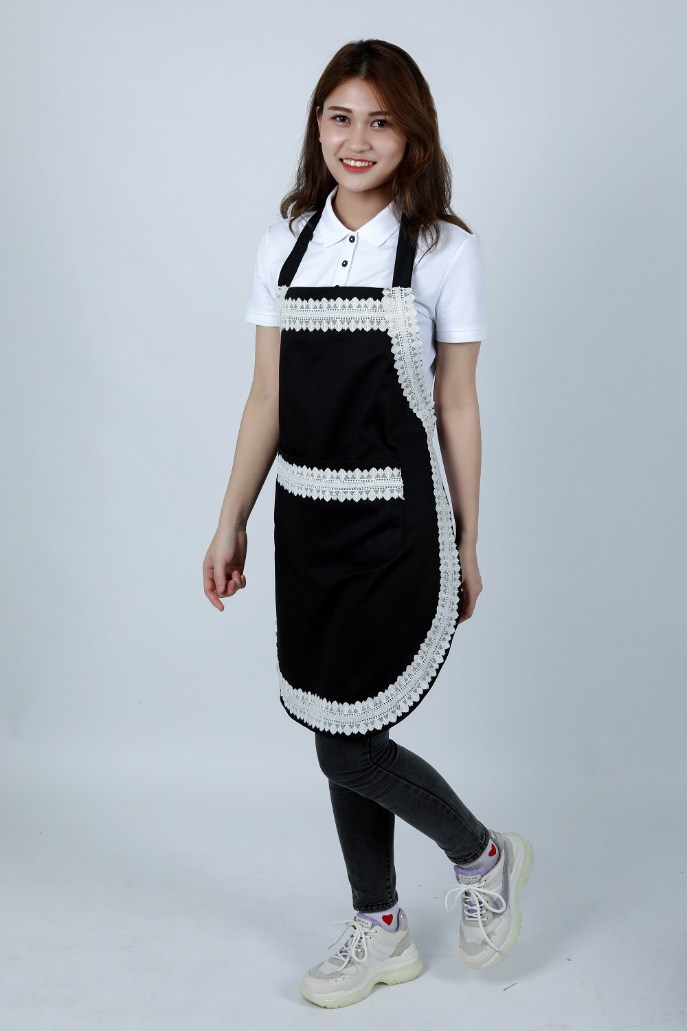 - Kiểu dáng: Tạp dề yếm dài có túi lớn phía trước, điểm nhấn thiết kế với phần phối ren tại viền túi và viền quanh tạp dề.