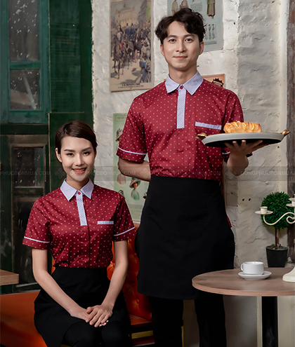 - Màu sắc: Áo màu đỏ phối họa tiết chấm bi xám xanh. Tạp dề ngắn màu đen trơn. Khách hàng có thể tùy chọn màu sắc theo mong muốn.