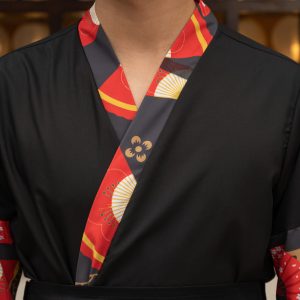 - Về màu sắc: Gam màu chủ đạo của mẫu đồng phục nhà hàng Nhật Bản mẫu 11 là đen, điểm nhấn nổi bật ở phần vạt chéo màu đỏ. Tuy nhiên, khách hàng cũng có thể lựa chọn màu sắc theo nhu cầu và thương hiệu của nhà hàng.