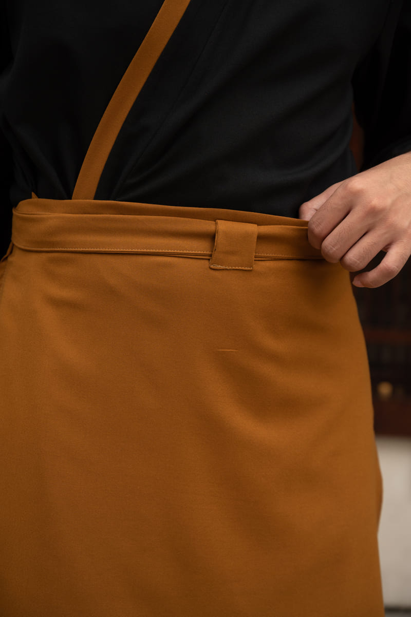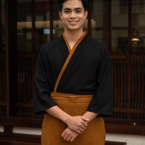 Đồng phục nhà hàng Nhật Bản màu đen nâu kết hợp tạp dề dáng ngắn