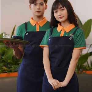 Áo đồng phục nhà hàng xanh lá cây đậm cổ cam phối tạp dề đen