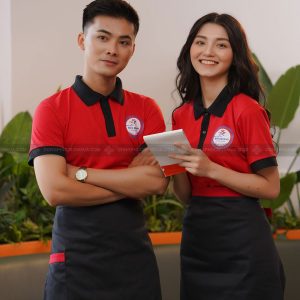 Đồng phục nhân viên nhà hàng màu đỏ phối đen phối tạp dề