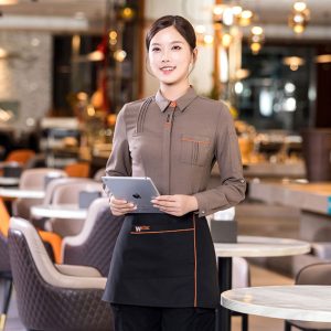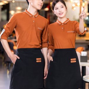 Đồng phục nhà hàng màu nâu cam cổ viền trắng
