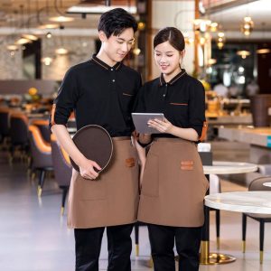 Mẫu trang phục nhà hàng màu đen phối tạp dề nâu