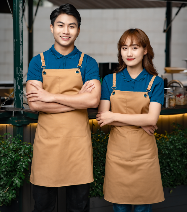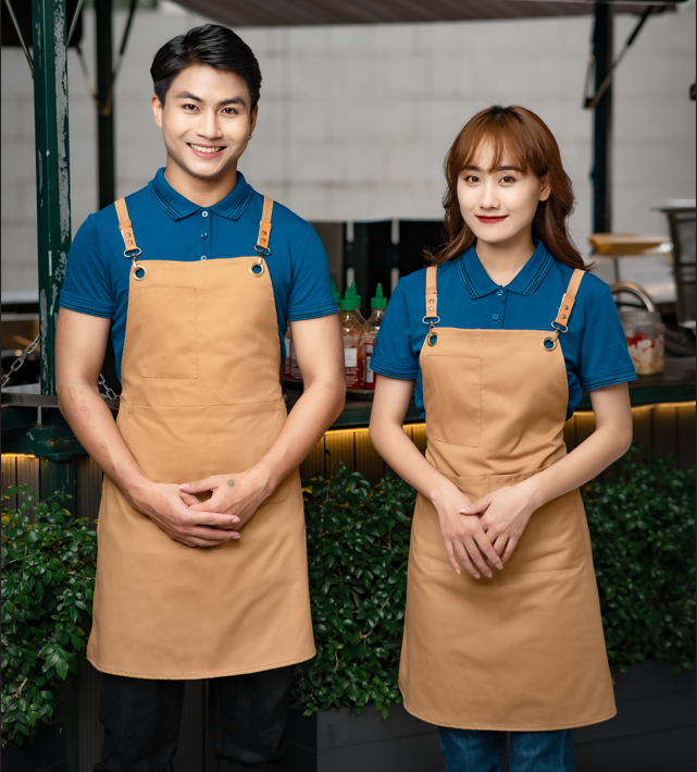 - Màu sắc: Áo màu xanh nước biển. Tạp dề màu nâu bò. Khách hàng có thể tùy chọn màu sắc theo sở thích.