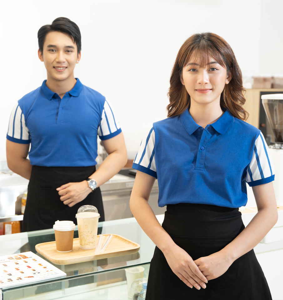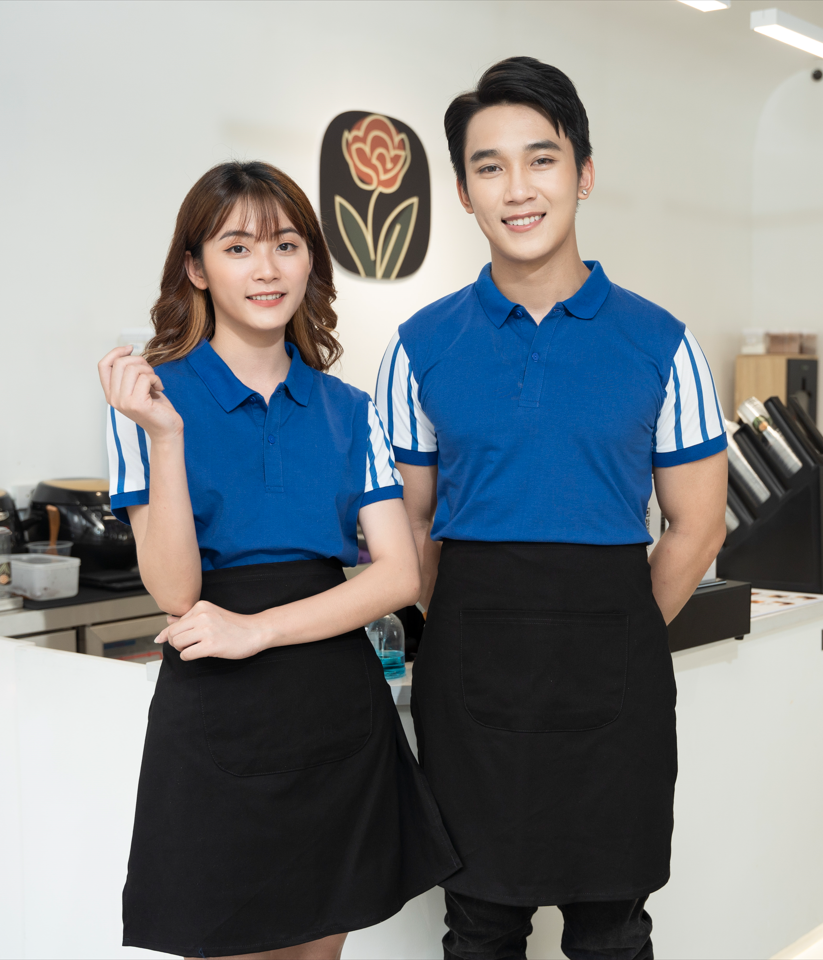 • Màu sắc: Áo màu xanh dương. Tạp dề màu đen. Khách hàng có thể tùy chọn màu sắc theo sở thích.