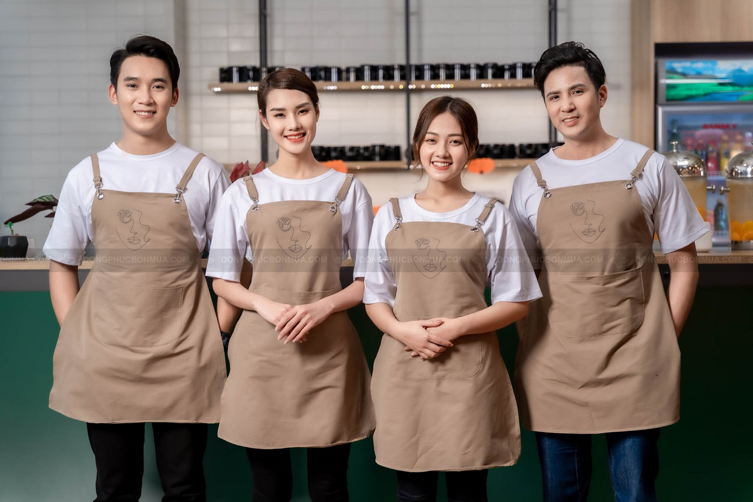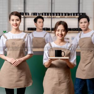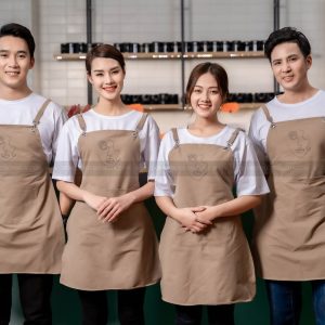 - Màu sắc: Áo trắng. Tạp dề màu nâu nhạt. Khách hàng có thể linh hoạt thay đổi màu sắc theo nhận diện thương hiệu.