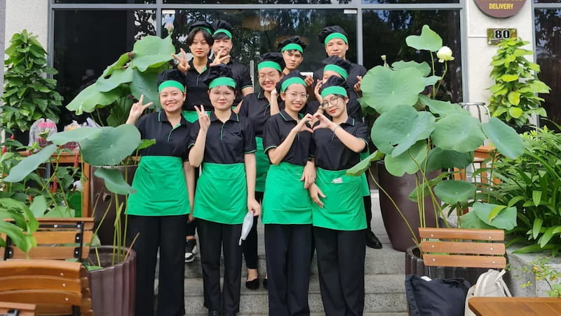 Đồng phục nhà hàng chay được thiết kế đơn giản, không màu mè