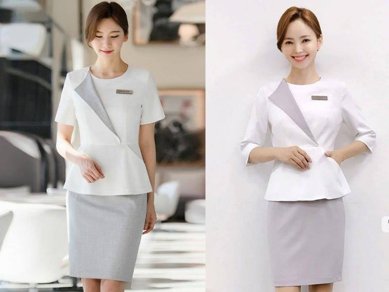 - Về thiết kế: Đồng phục quản lý Spa mẫu 05 bao gồm áo và chân váy riêng. Áo có màu trắng tinh khôi cổ tròn thanh lịch, tay áo ngắn phù hợp với môi trường làm việc trong Spa hay thẩm mỹ viện. Kết hợp là vạt áo chéo 1 bên màu xám tạo điểm nhấn. Từ eo trở xuống áo được thiết kế dáng đuôi cá hơi xoè tôn lên vóc dáng người mặc. Bên dưới là chân váy công sở trên đầu gối rất lịch sự.