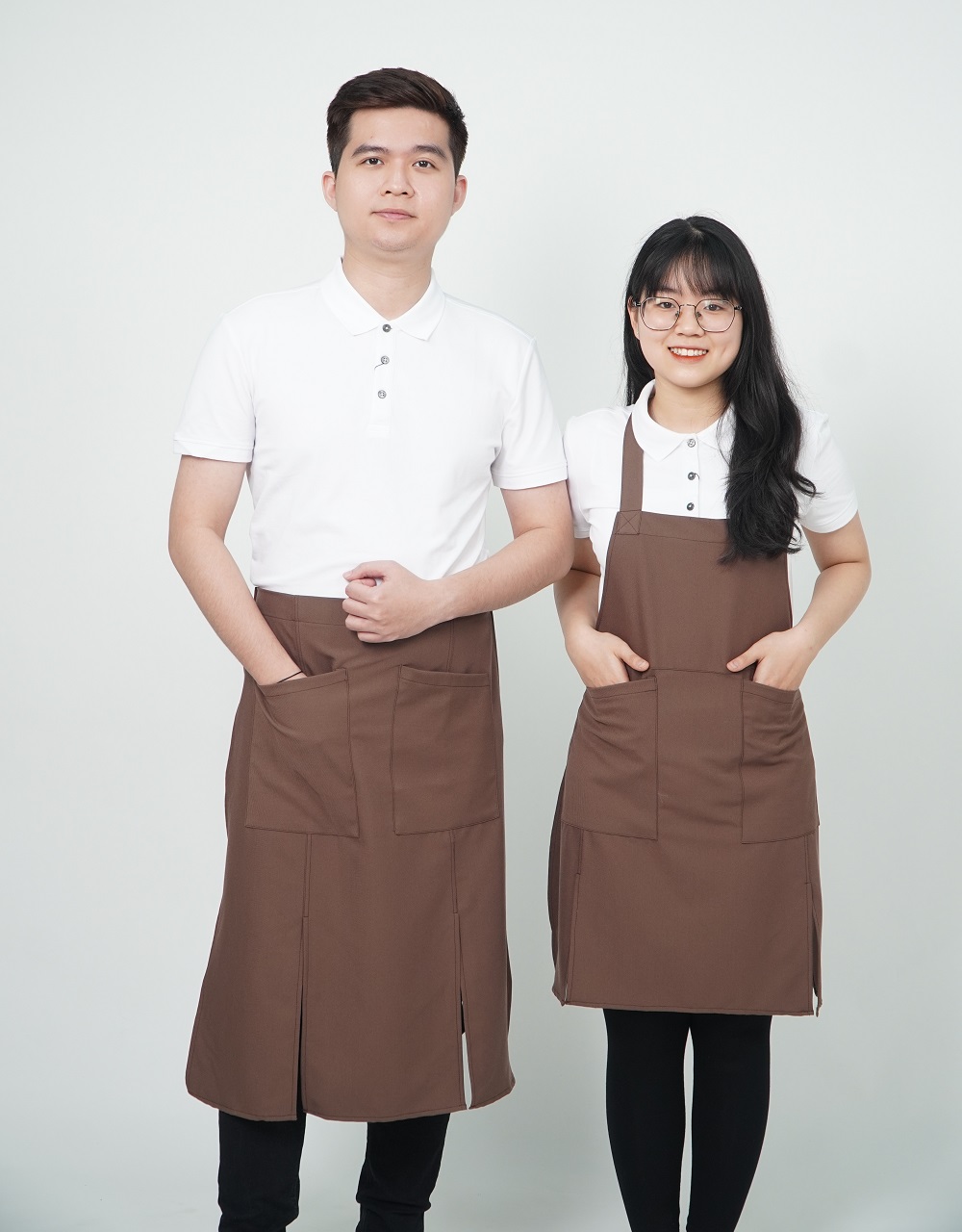 - Kiểu dáng: Tạp dề dạng yếm trơn dáng basic, có dây đeo tùy chỉnh kích thước, túi 2 bên đựng đồ và xẻ tà ở vạt. Tạp dề nửa người dáng dài cột ngang hông, có túi phía trước và xẻ tà ở phần vạt.