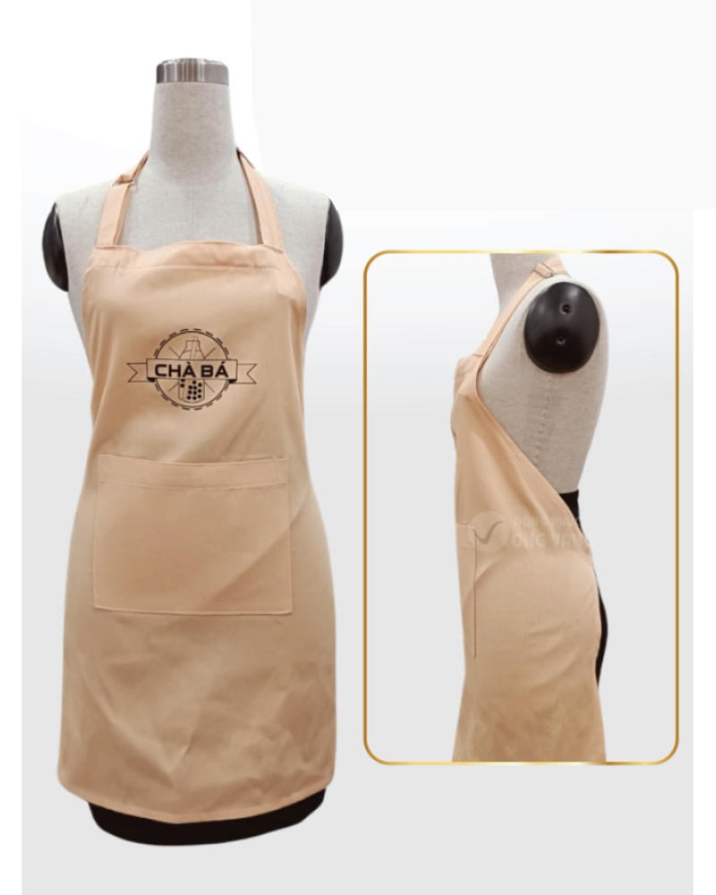 - Trước ngực tạp dề các nhà hàng có thể in logo và tên thương hiệu lên để tăng tính nhận diện. Ngay dưới logo được may thêm túi kích thước lớn, giúp nhân viên đựng vật dụng cá nhân rất thuận tiện. Kết hợp với màu be chủ đạo mang đến sự thanh lịch và nhẹ nhàng thu hút người nhìn.