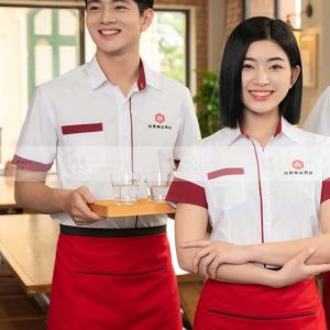 Đồng phục tạp dề dáng ngắn màu đỏ kết hợp sơ mi trắng Manwah
