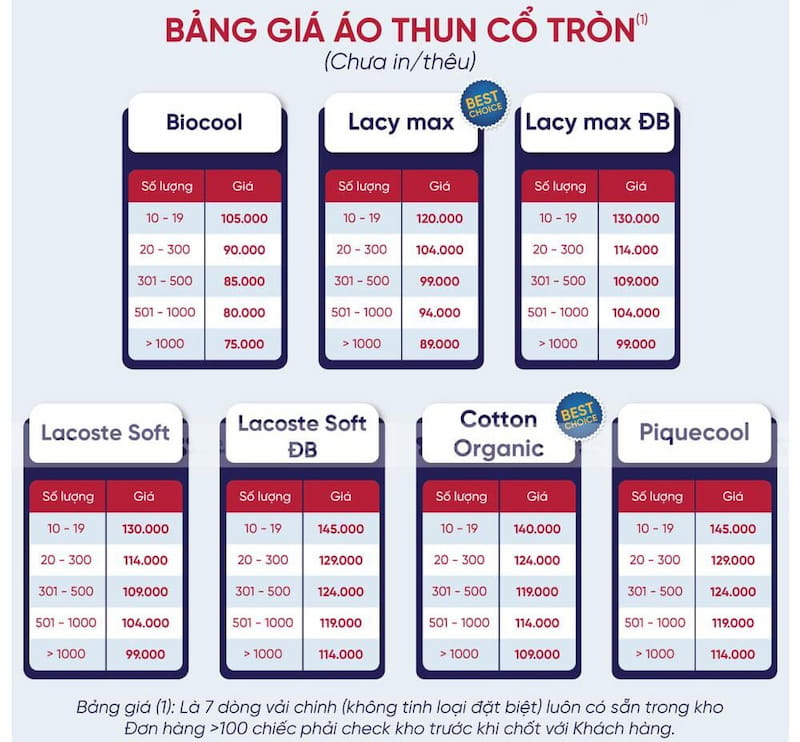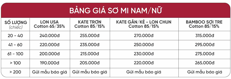 Bảng giá may đồng phục số lượng ít tham khảo