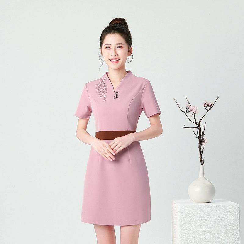 - Về kiểu dáng: Đồng phục Spa mẫu 04 được thiết kế kiểu dáng váy liền tay ngắn, một trong những kiểu dáng thường được các spa ưa chuộng. Điểm nhấn của bộ trang phục nằm ở phần cổ chữ V kín đáo, thanh lịch, nổi bật dưới là hàng cúc dưới cổ được may thẳng tắp.